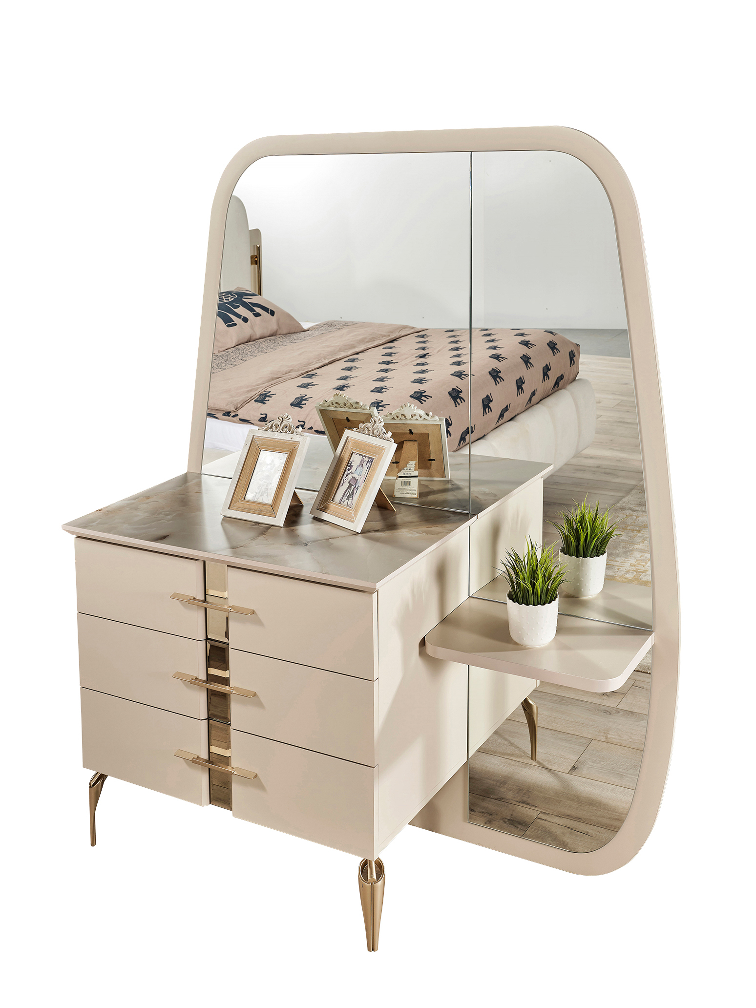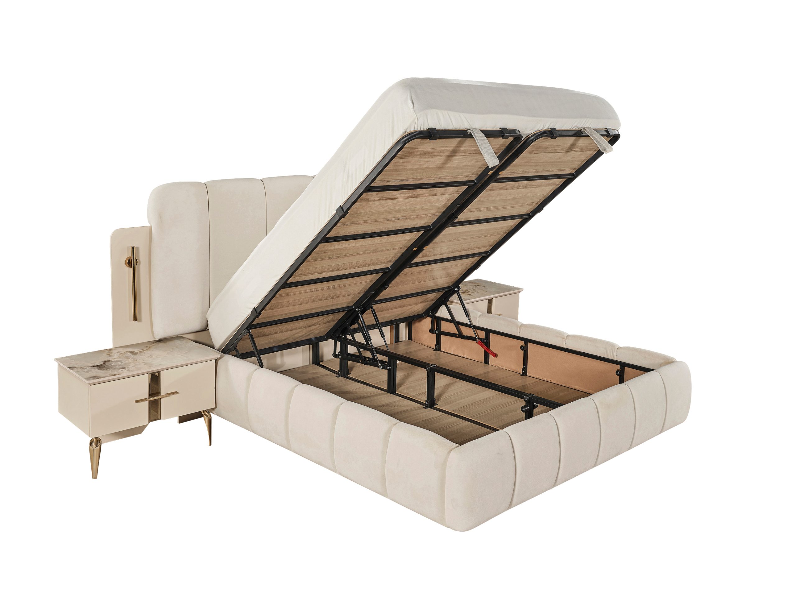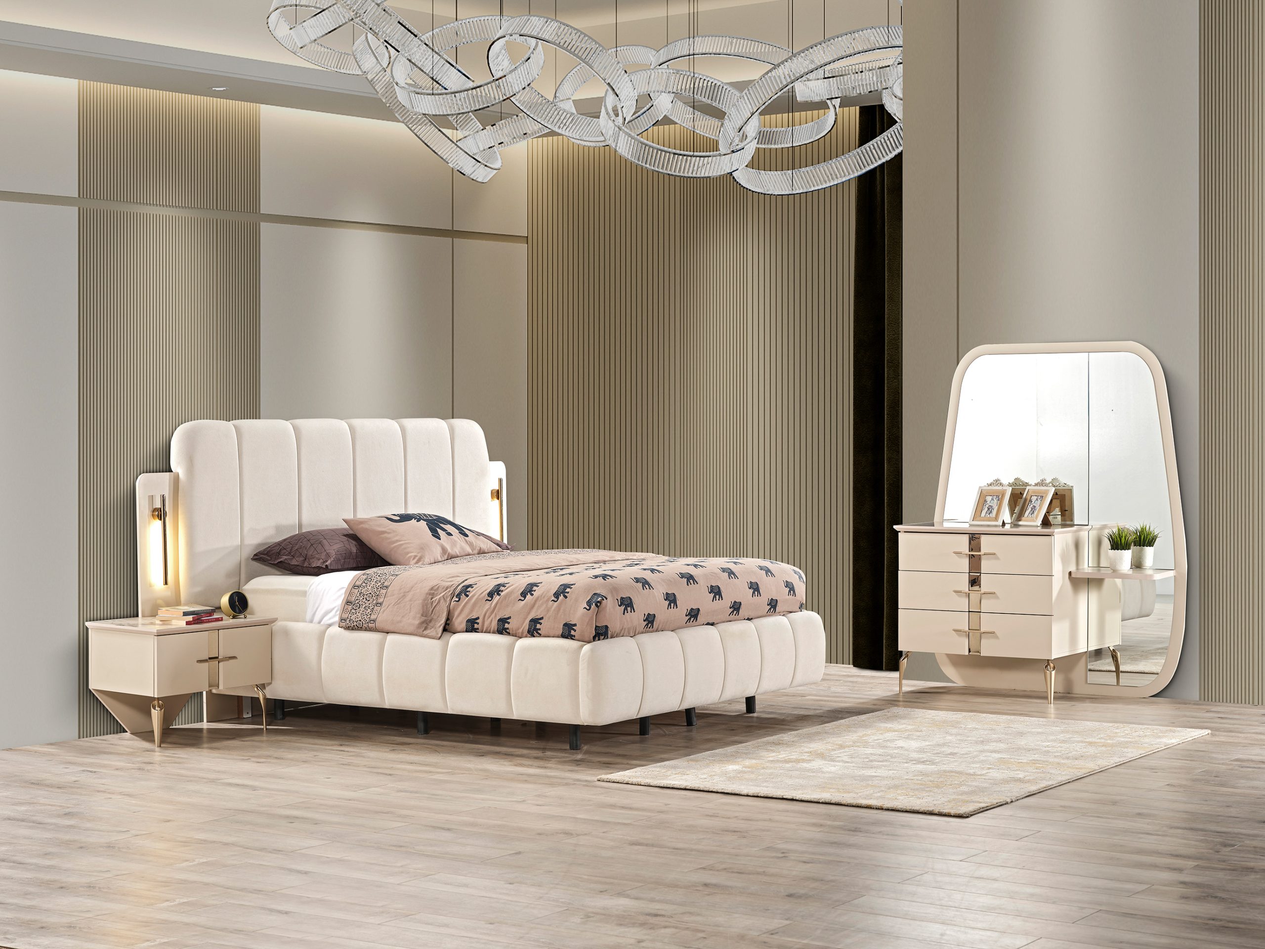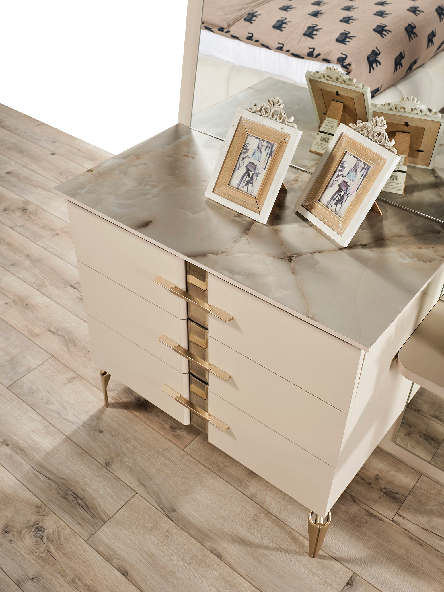 Altın detaylarla zenginleştirilen bu özel takım; rahat bir uyku alanı yaratmanın yanı sıra geniş depolama seçenekleriyle de yaşam alanınızı organize etmenize yardımcı olur.