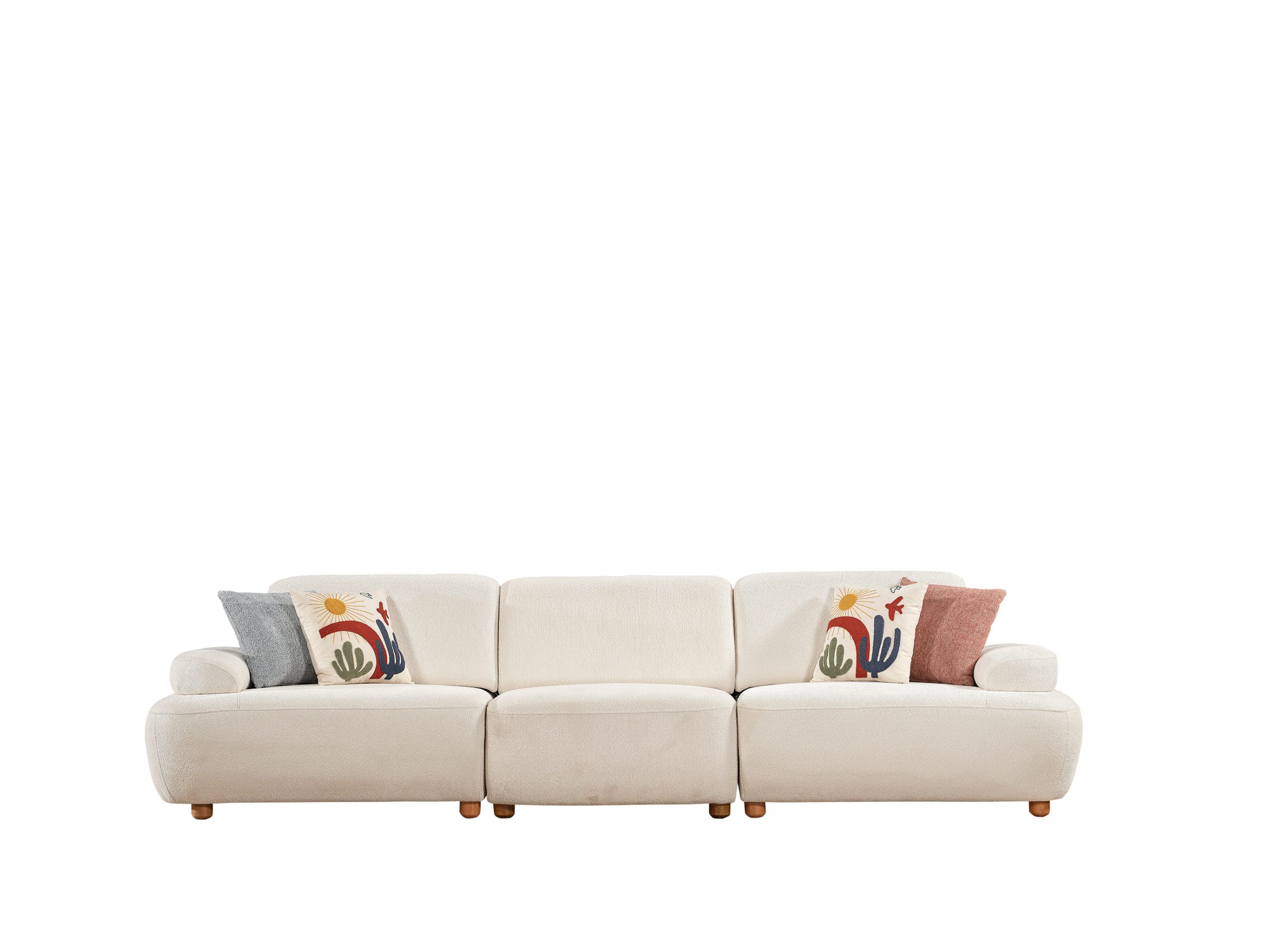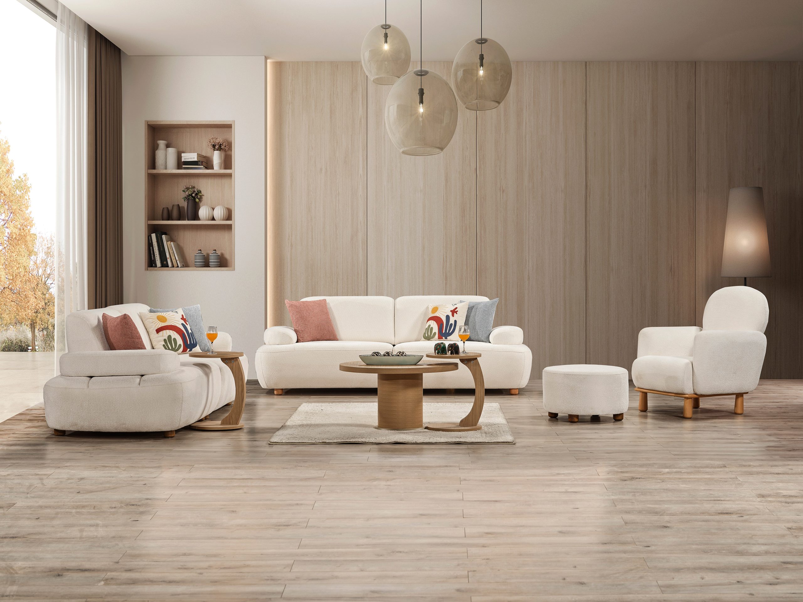 Yumuşak kıvrımları, ahşap ayak detayları ve estetik formu ile göz dolduran bu koltuk takımı, evinizin havasını