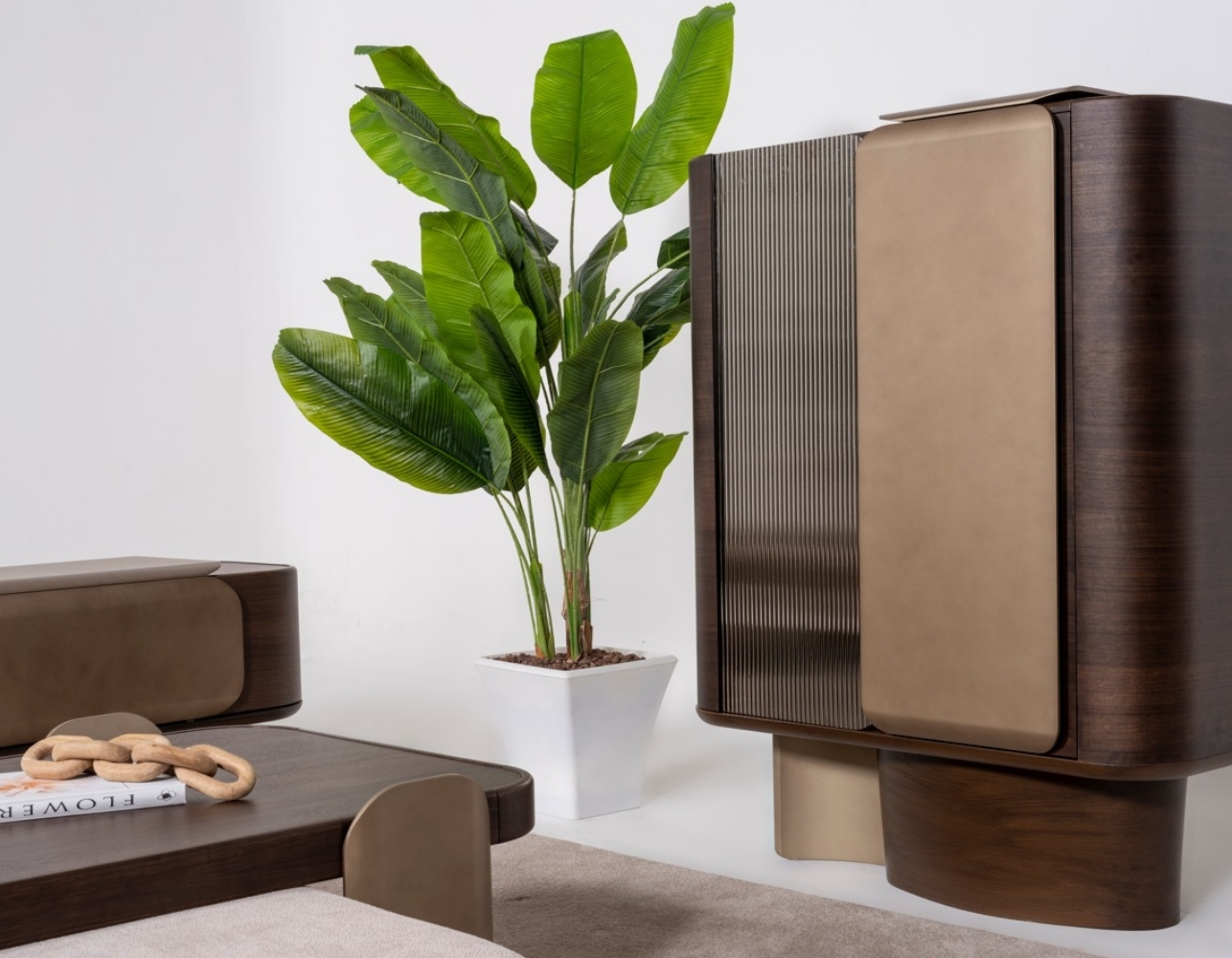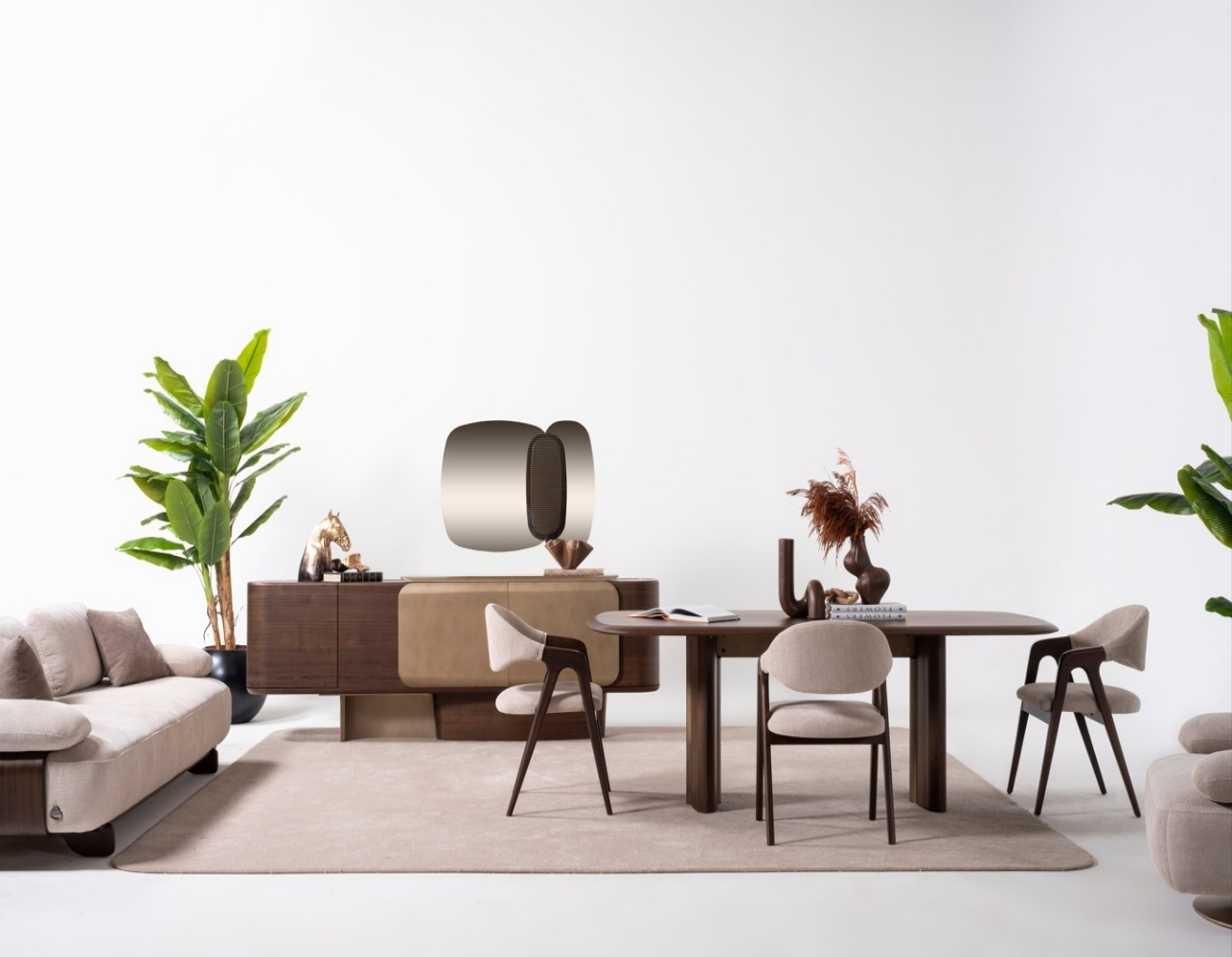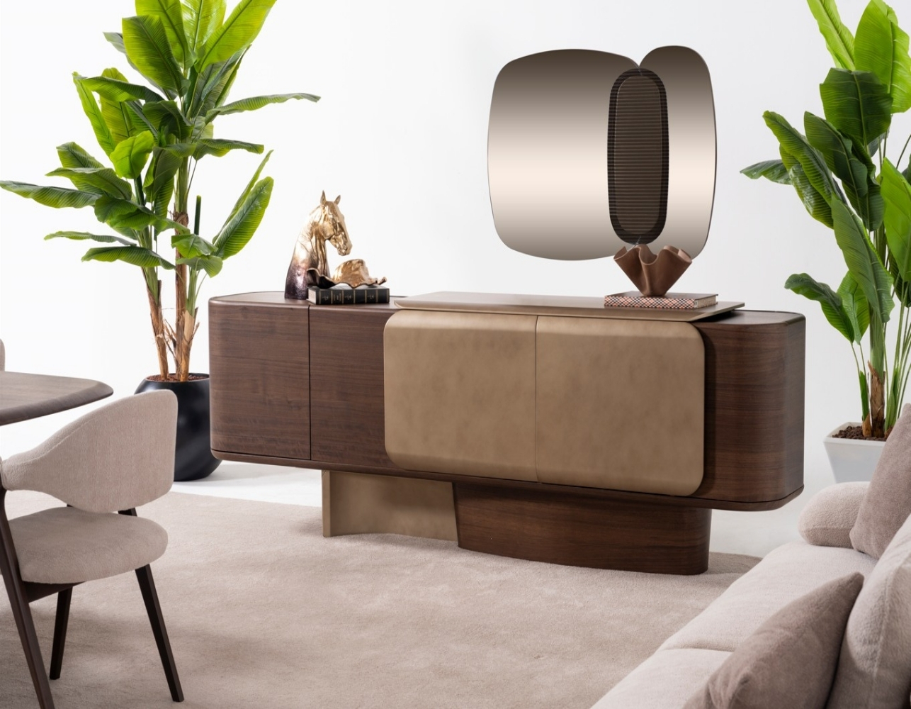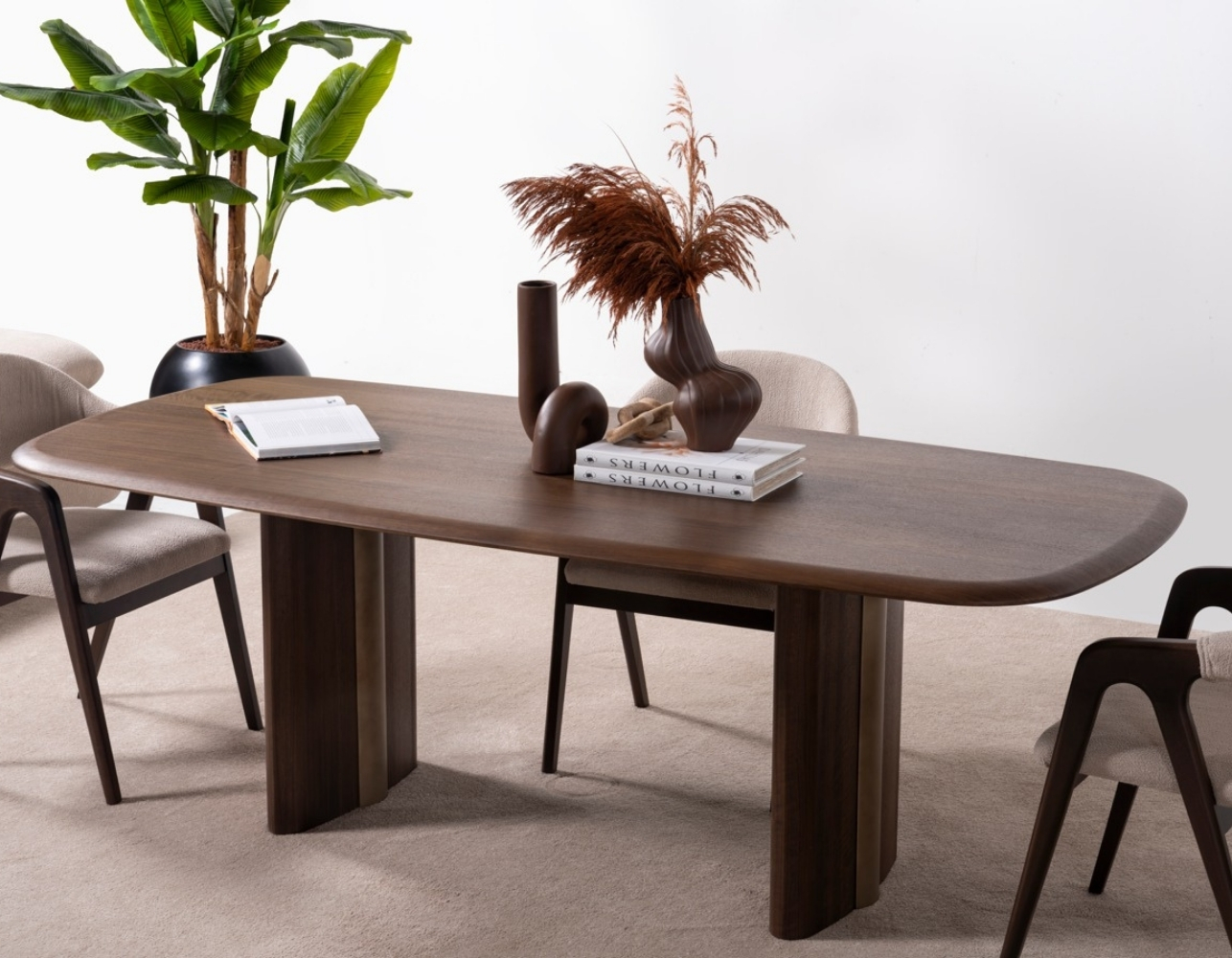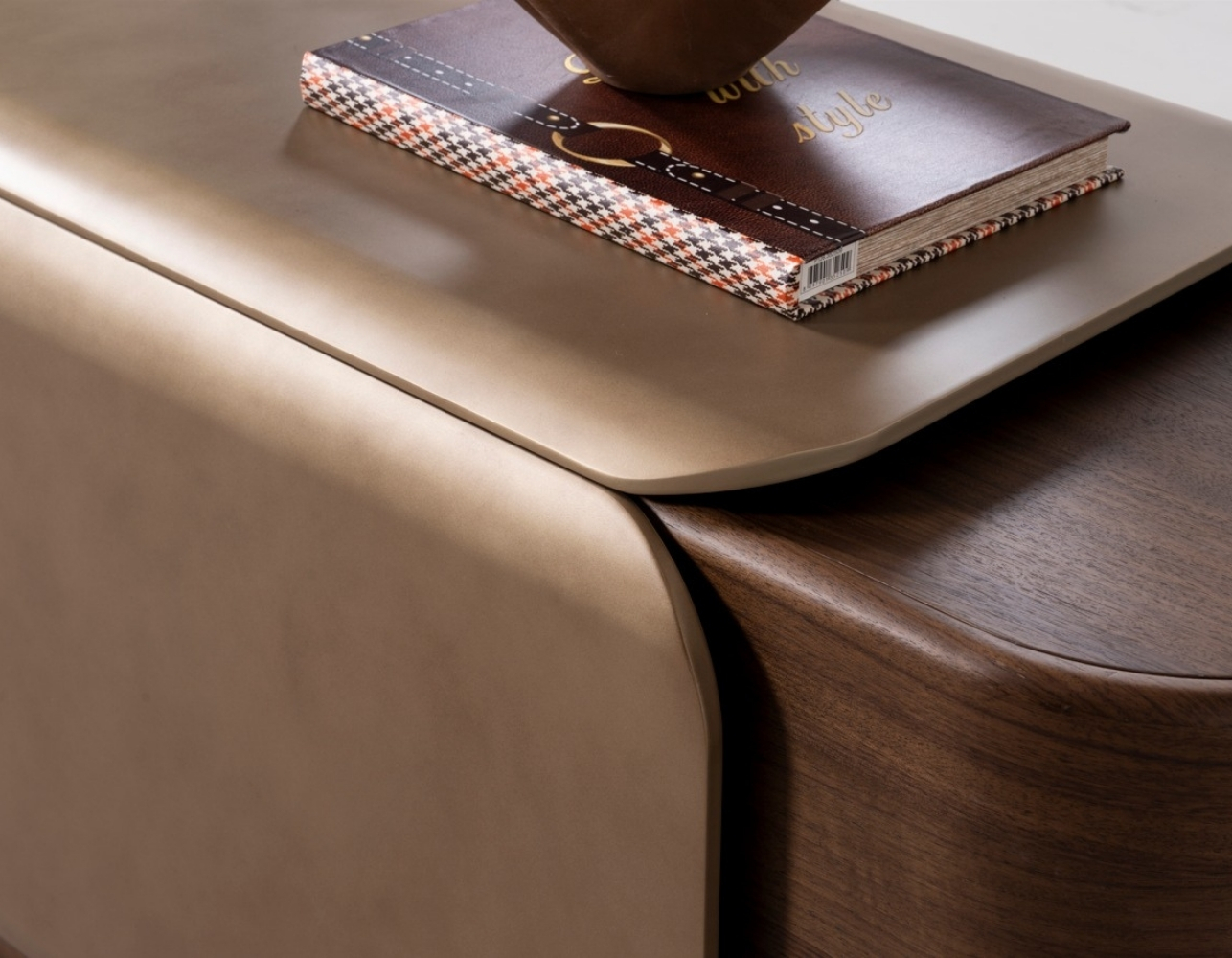 Oval hatlara sahip masa ve konsol detayları, tasarımda akıcılık sağlarken; deri görünümlü kapaklar, sıcak ceviz yüzeylerle mükemmel uyum yakalar.
