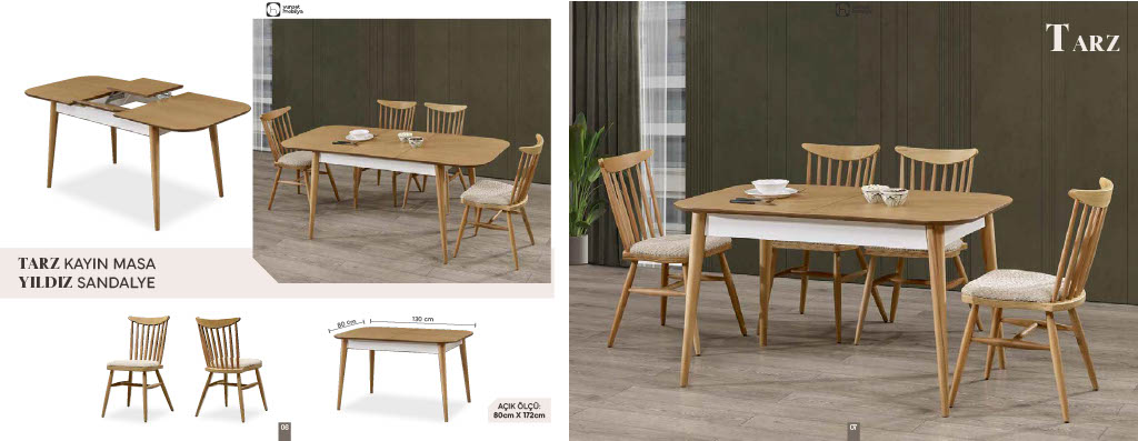 Doğallığın modernlikle buluştuğu Tarz Kayın Masa & Yıldız Sandalye Takımı, sıcak tonları ve zarif tasarımıyla iç mekânlara ferahlık katıyor. Açılabilir masa fonksiyonu sayesinde kullanım alanınızı ihtiyaca göre genişletebilir, ergonomik yapısıyla öne çıkan yıldız sırtlı sandalyelerle şıklığı ve konforu bir arada yaşayabilirsiniz.