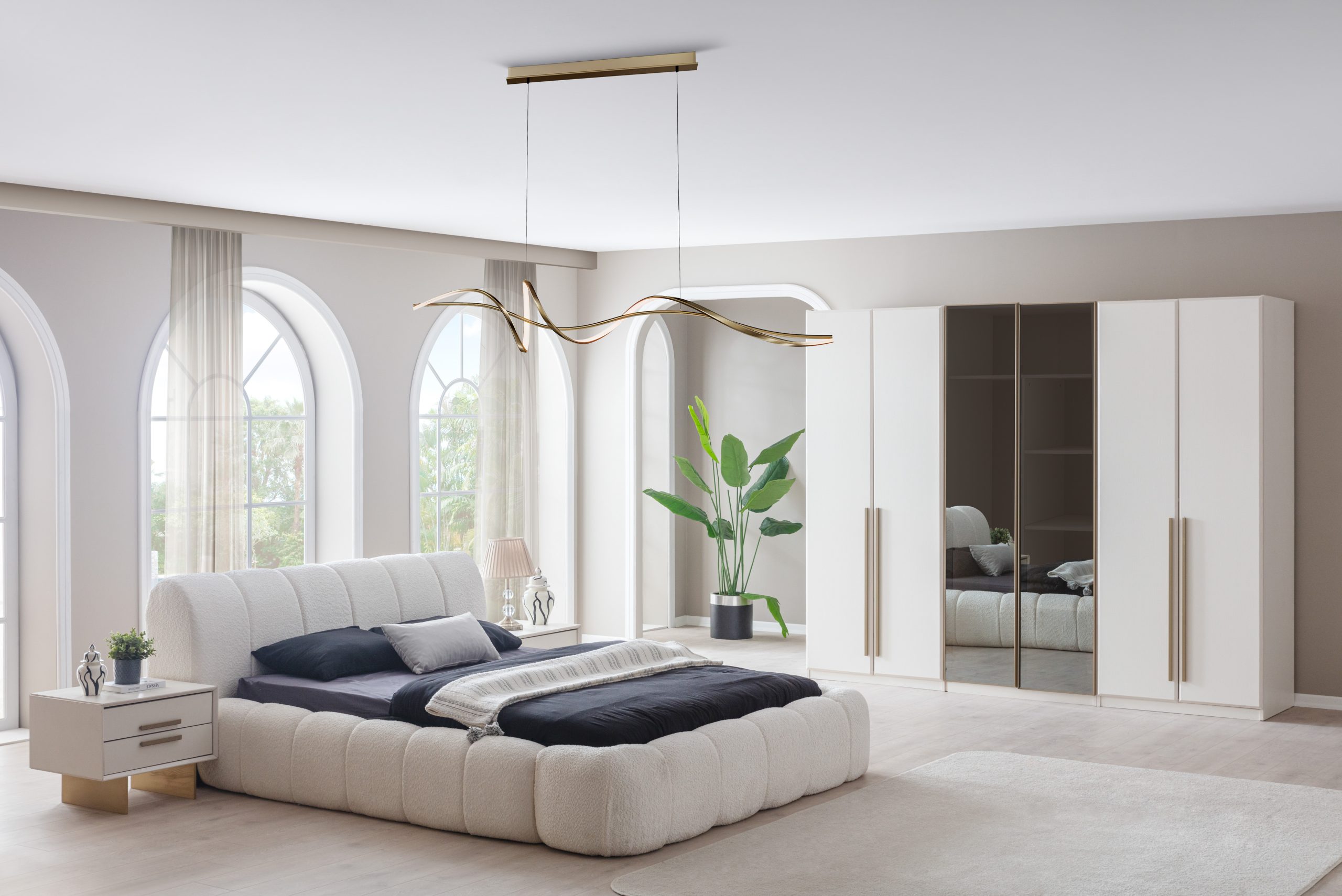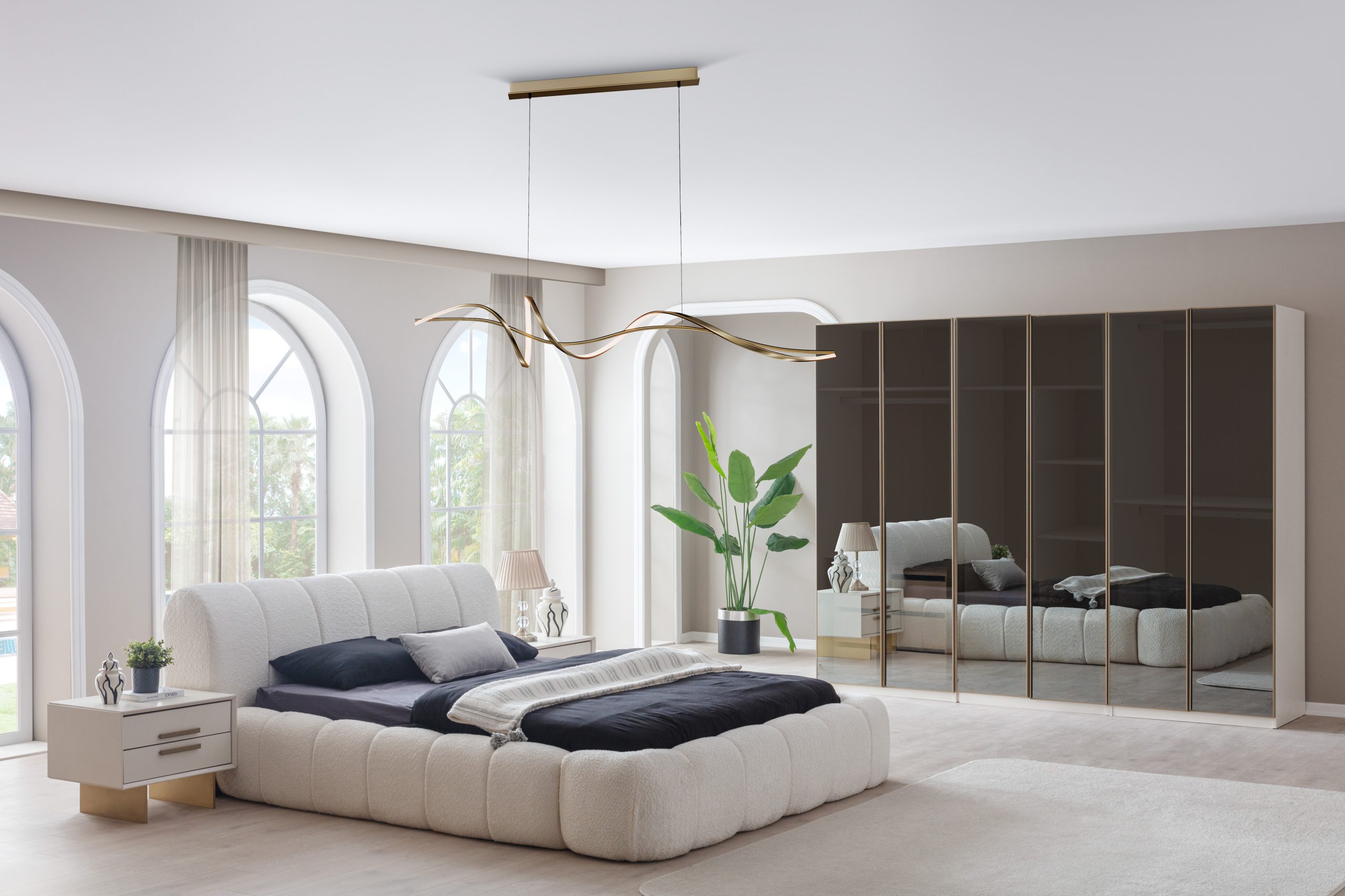 Modern ve minimalist çizgilerle tasarlanmış bu yatak odası, lüksü ve fonksiyonelliği birleştiriyor.