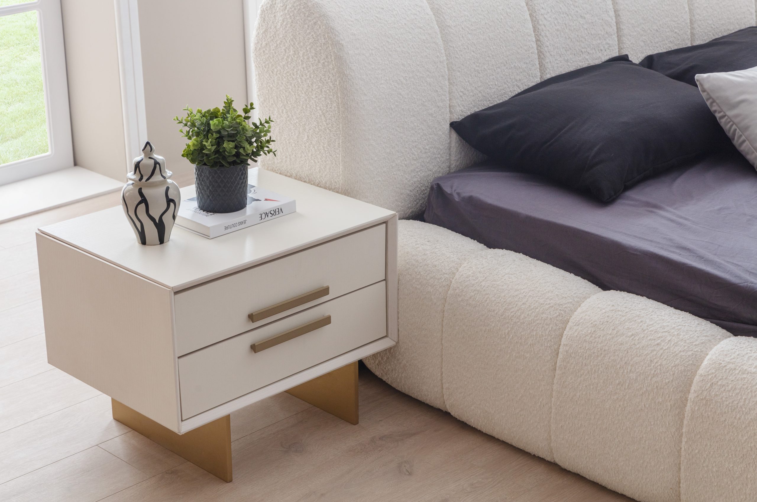Fonksiyonel Depolama: Yatak başlığı ve komodinler, sadece görsel açıdan estetik değil, aynı zamanda işlevsel depolama alanları sunuyor.